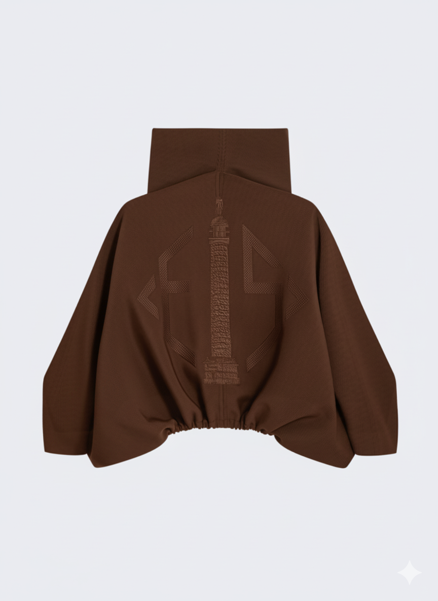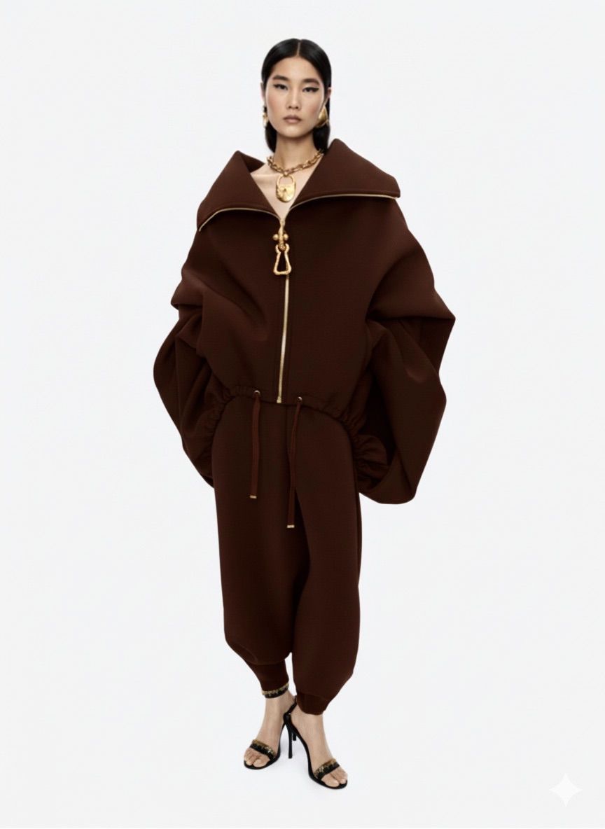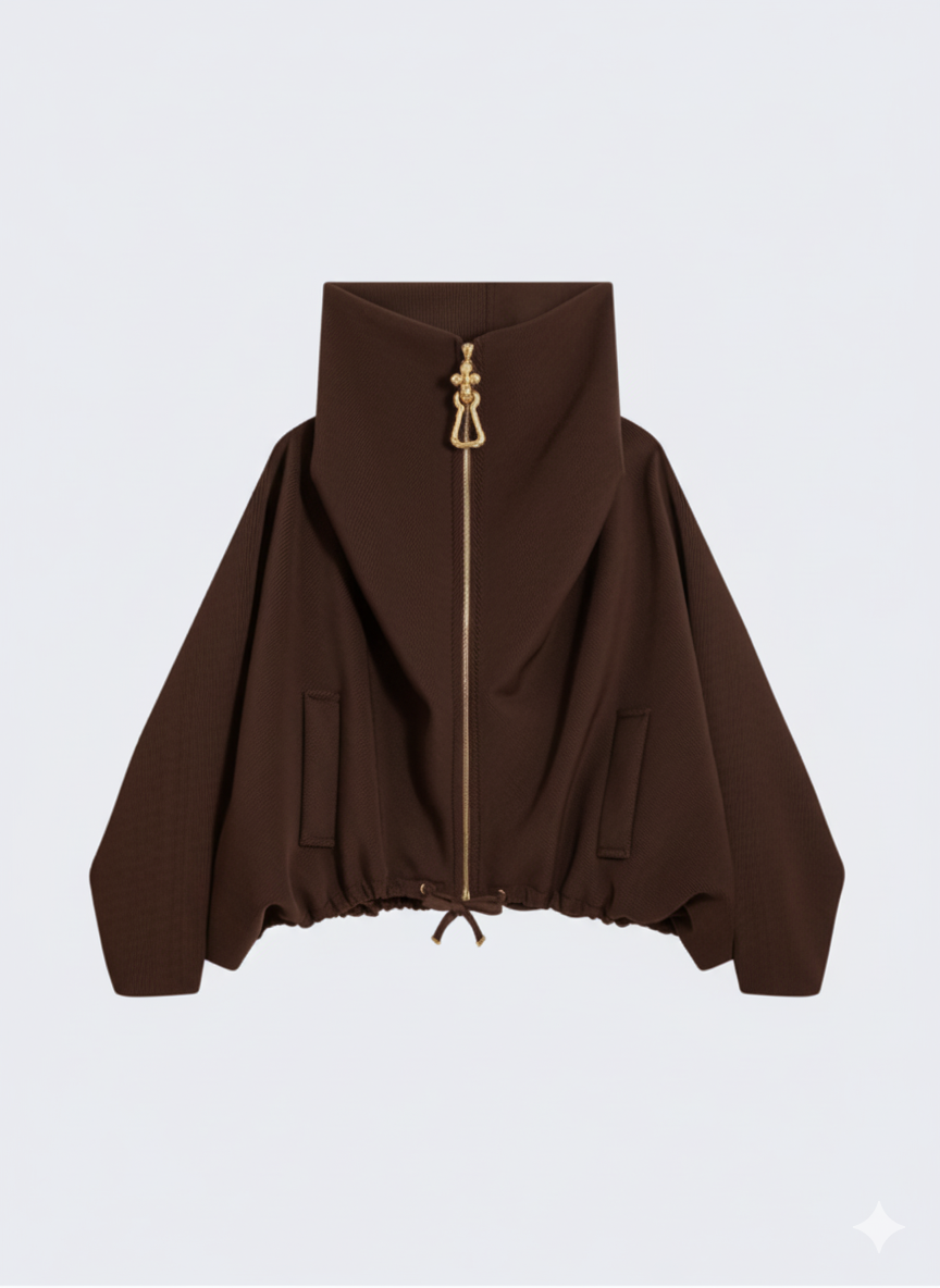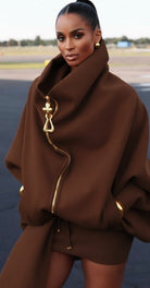 Elevate your style with the Coffee Brown Arles Zip Up Jacket, featuring a roomy fit and an eye-catching oversized collar for a bold statement. The gold hardware keyhole zipper pendant adds a touch of luxury, while the versatile black color complements any outfit. Designed for comfort and effortless chic, this jacket is perfect for layering throughout the seasons. Available also in elegant black to suit your wardrobe needs.