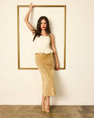 Elevate your evening look with the Dijon Gold Skirt, a stunning midi piece that commands attention. Crafted with intricate gold sequins and delicate beading, this skirt delivers luxe sophistication for any special occasion. The flattering midi length offers versatility—pair it with a sleek top for cocktail events or layer it for a polished brunch aesthetic. Premium construction ensures the embellishments stay secure through wear and care. Perfect for those who refuse to blend into the background.