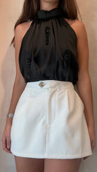 Elevate your wardrobe with the Maddy Skort in White, featuring a chic jewel button detail that adds a touch of elegance. This versatile piece combines the comfort of shorts with the stylish look of a skirt, perfect for effortless day-to-night wear. Whether for casual outings or dressier occasions, the Maddy Skort offers a flattering fit and sophisticated charm that enhances any outfit.