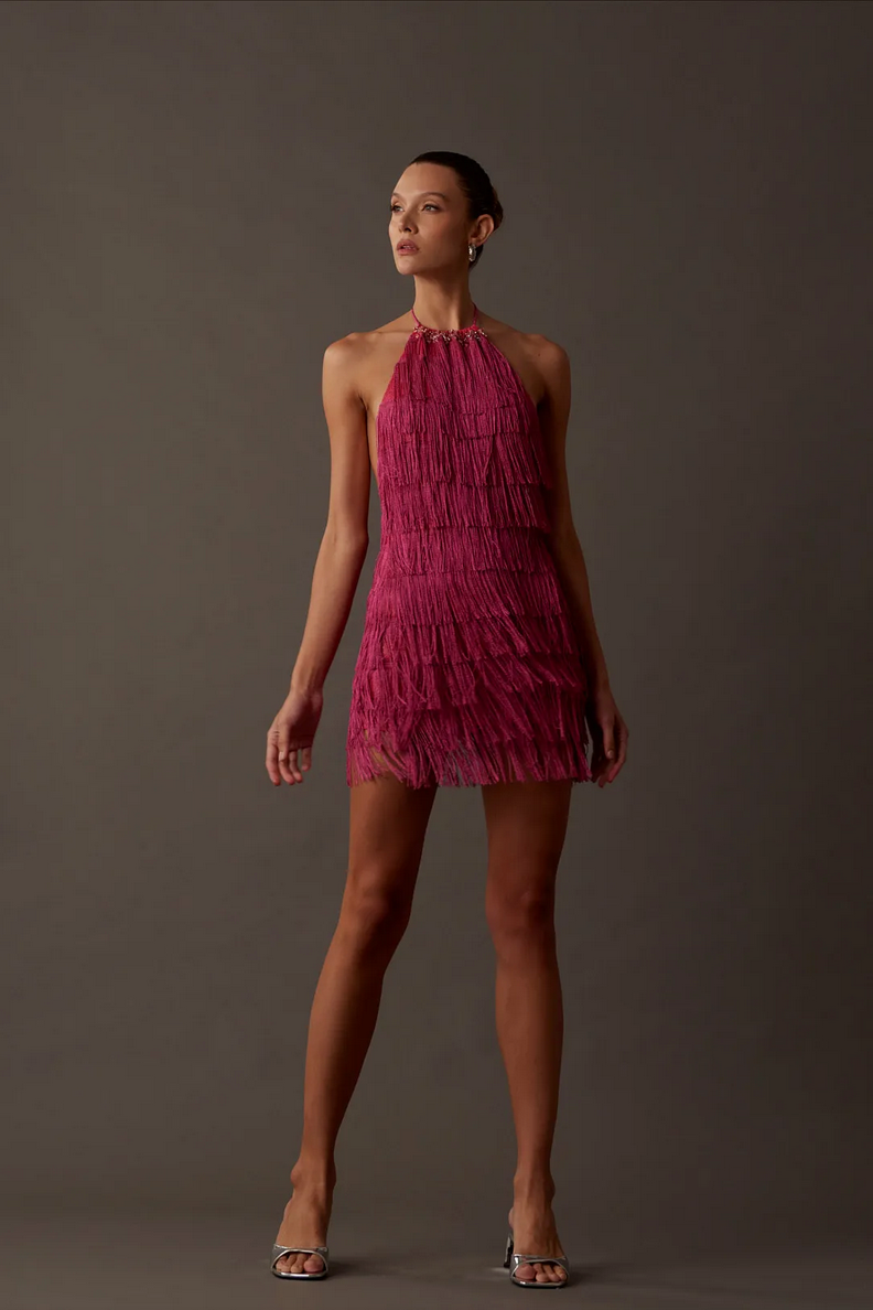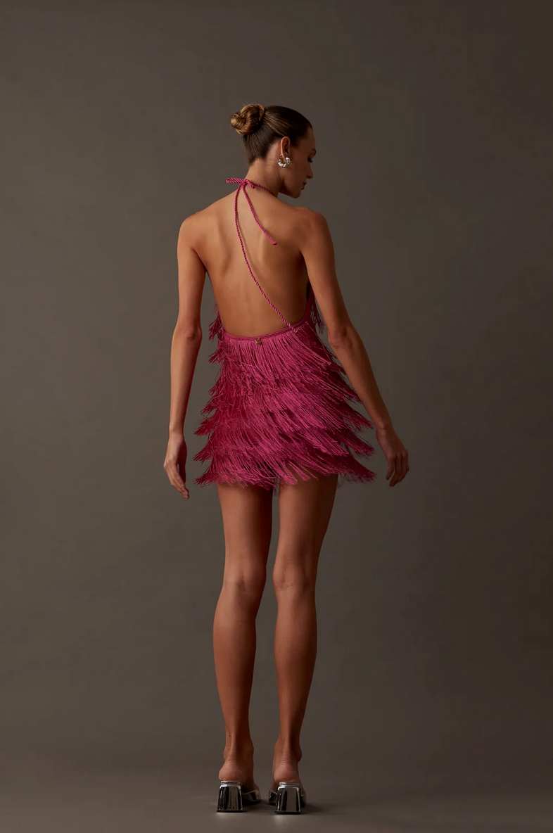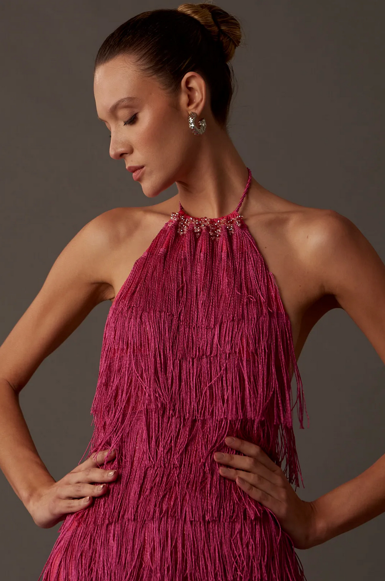 Cada ocasión es especial con nuestra versión corta del vestido JOYA. Su escote halter añade elegancia, mientras que la espalda descubierta crea un look cautivador. Se adapta al cuerpo y a todos sus movimientos gracias a el estilo inconfundible de nuestros flecos característicos que hacen que cada pieza sea única y emocionante de llevar. Sin duda, tus clientes se sentirán atraídos por el encanto de este diseño.