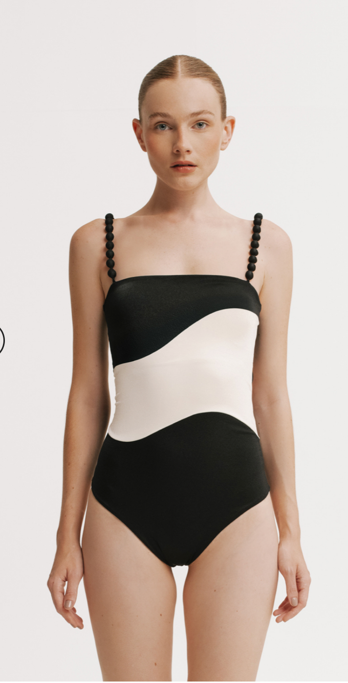 Embrace timeless elegance with the Lara Black One Piece swimsuit, featuring striking black and white abstract wave patterns. Delicate beaded straps add a touch of sophistication, while the one-piece design offers both comfort and style. Perfect for making a confident statement at the beach or poolside.