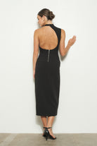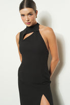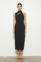 High collar cut out sleeveless midi dress.