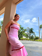 Pink and Red details Midi Dress with Adjustable Straps and Zipper