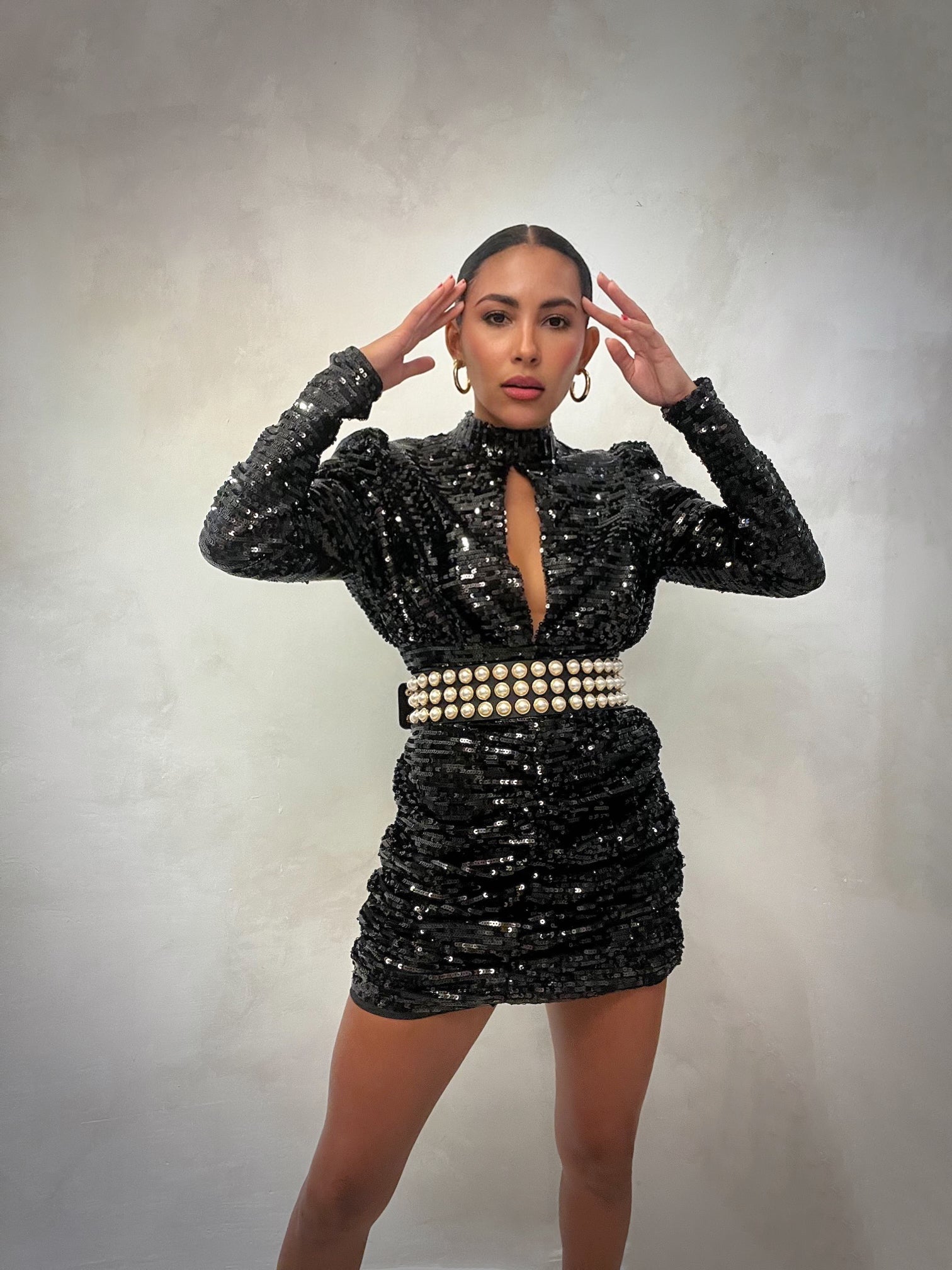 Long Sleeve sequin dress.