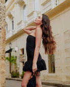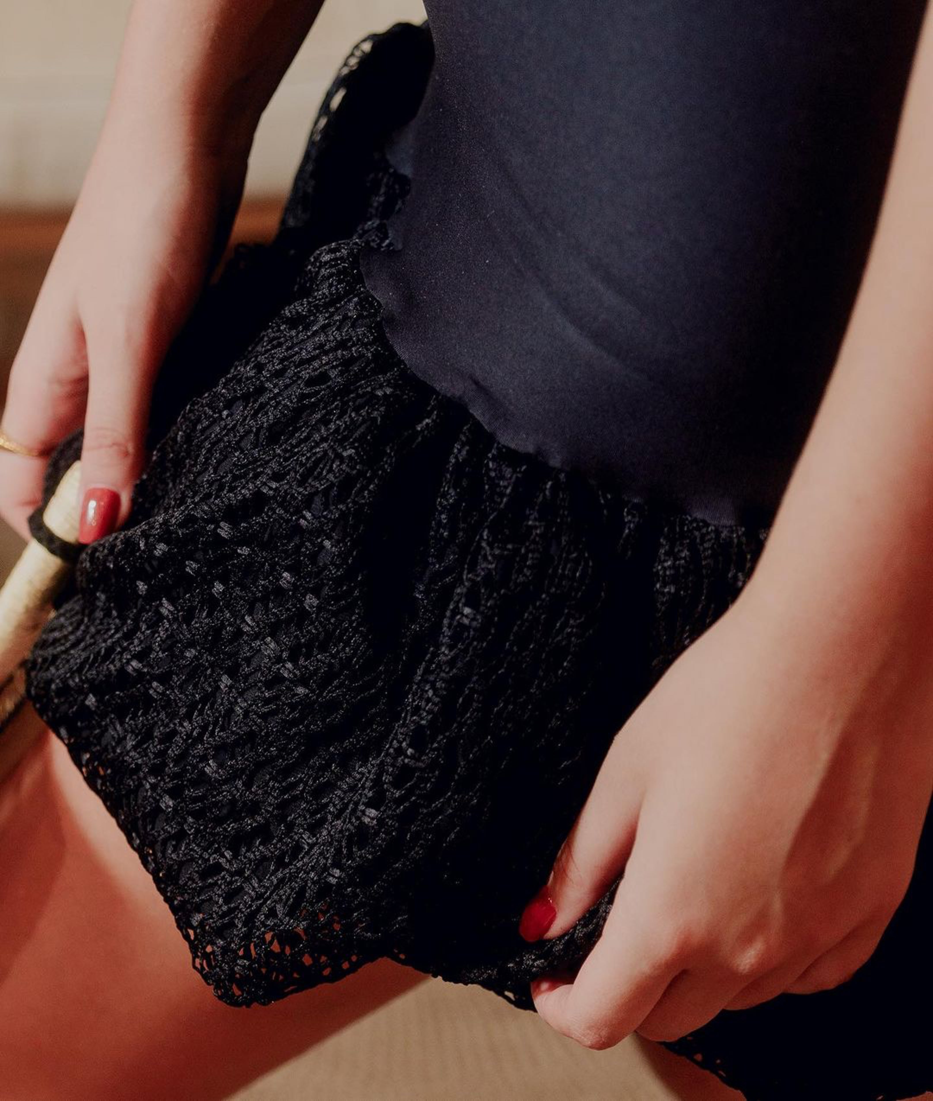 Preorder our Handmade Bubble Black mini dress with crochet hem.