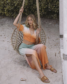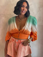 The Rainbow Sky Top features a bright Tie-Dye print, v-neck line, with medium sleeves and buttoms at front.