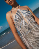 A luxe fitted maxi dress with a cross neck halter neckline and front cut out detail. This is made from an wave sequin embellished fine mesh fabric and fits like a dream!