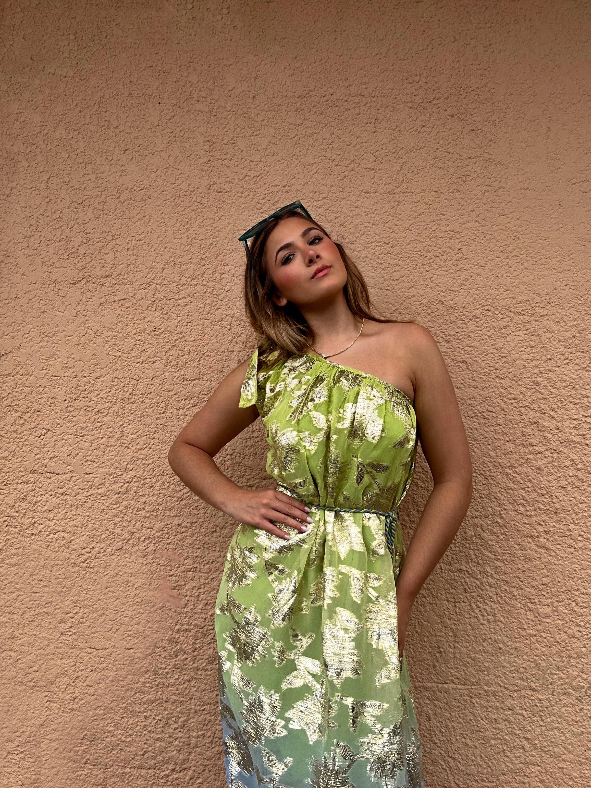But what truly sets this dress apart is the lurex woven into the fabric. Like rays of sunlight captured in thread, the lurex adds a shimmering touch of sparkle that glimmers and gleams with every step you take. It's a subtle yet striking detail that catches the eye and captures the imagination, evoking the magic of a sun-drenched afternoon.
