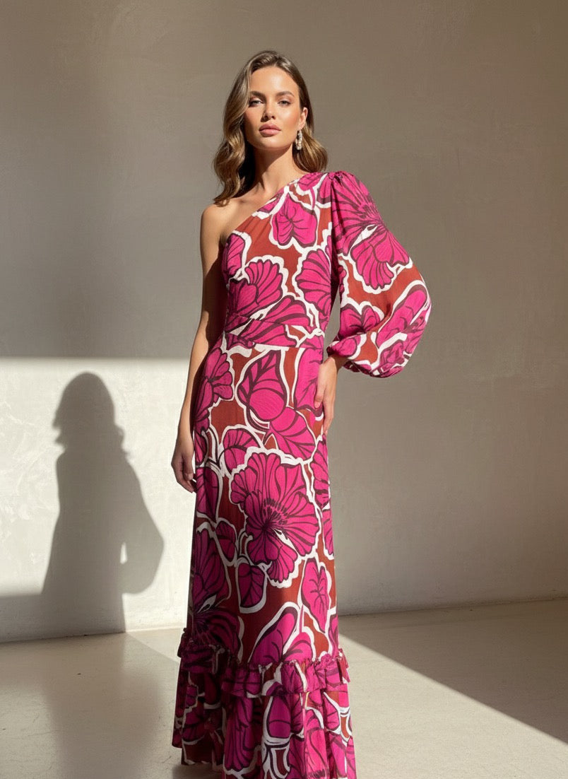 Elevate your evening look with the Lara One Shoulder Dress, a stunning maxi silhouette that commands attention. The asymmetrical one-shoulder design creates an effortlessly chic, modern aesthetic while the eye-catching print adds personality and flair. Perfect for cocktail events, weddings, or upscale dinners, this dress flatters with its flowing maxi length and sophisticated drape. The unique neckline draws focus to your shoulders and collarbone, making it an instant showstopper. Versatile enough to dress up or down, the Lara is your go-to piece for making a memorable impression at any occasion.