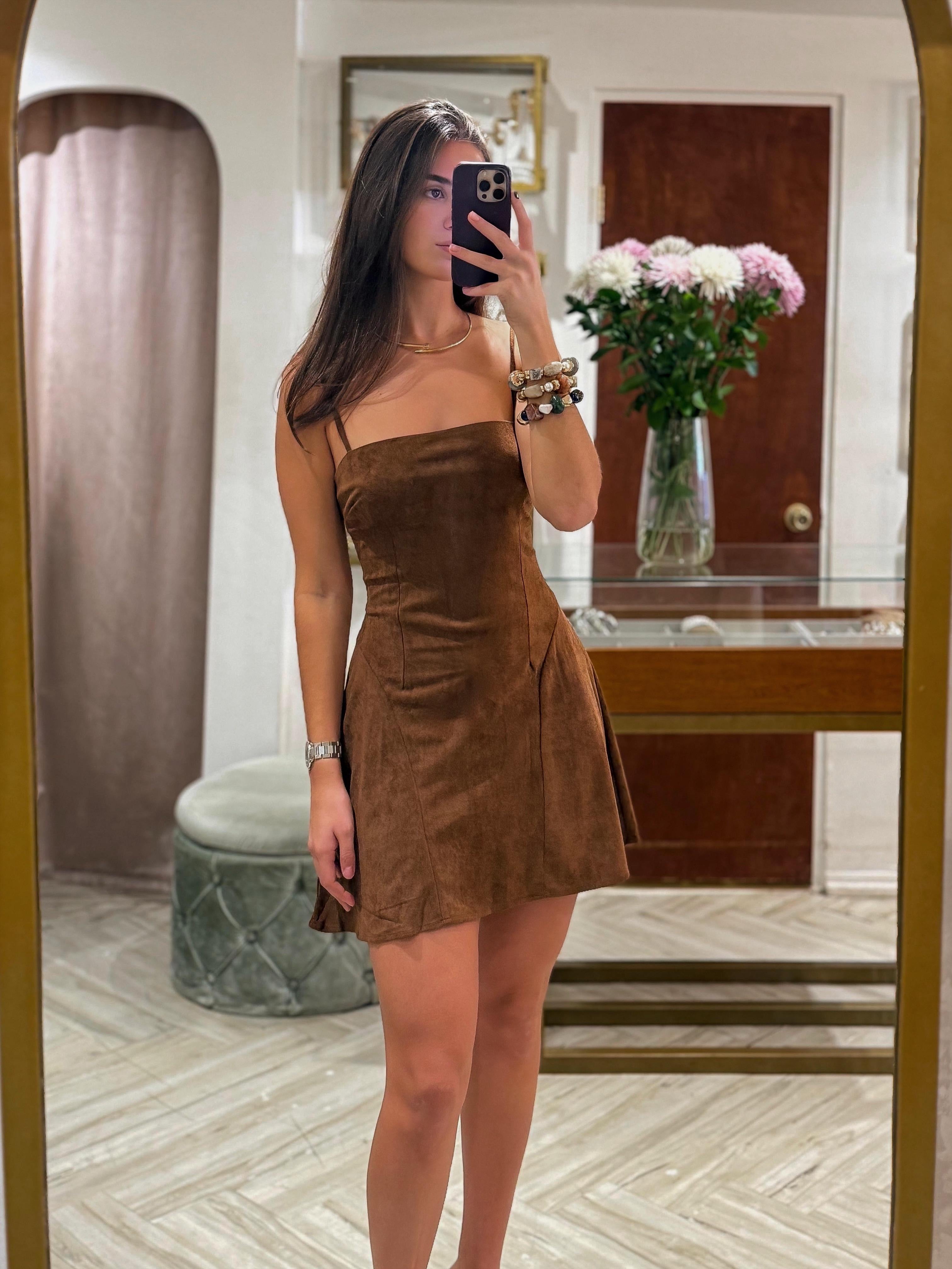 Elevate your wardrobe with the Zaela Suede Mini Dress, a timeless piece that effortlessly transitions from day to night. Crafted from luxuriously soft brown suede, this mini dress offers a flattering silhouette that celebrates your style. The rich, versatile brown tone pairs seamlessly with any accessory, while the premium suede fabric provides an upscale feel that turns heads. Perfect for date nights, casual outings, or special occasions, this dress delivers sophistication and comfort in one stunning package. Make a statement with understated elegance.