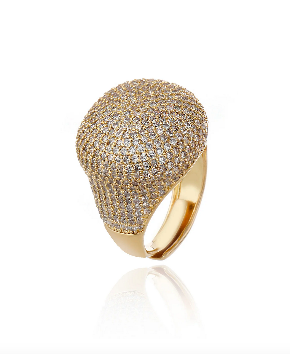 A bold statement piece, the Ceresolo Ring features an eye-catching dome fully adorned with shimmering zirconias. Its sculptural form and polished gold finish create a luxurious presence that instantly enhances any ensemble.