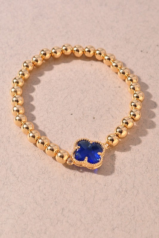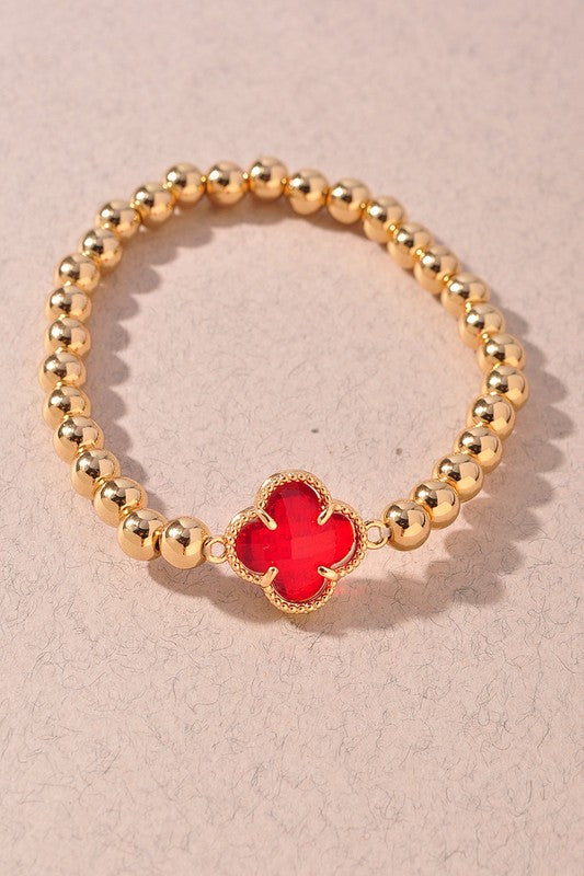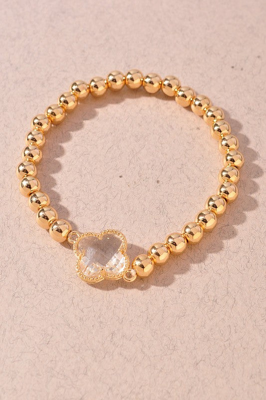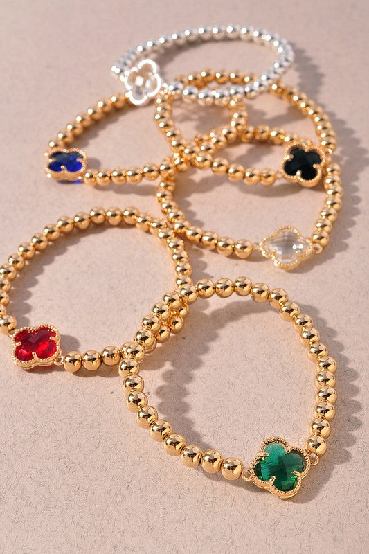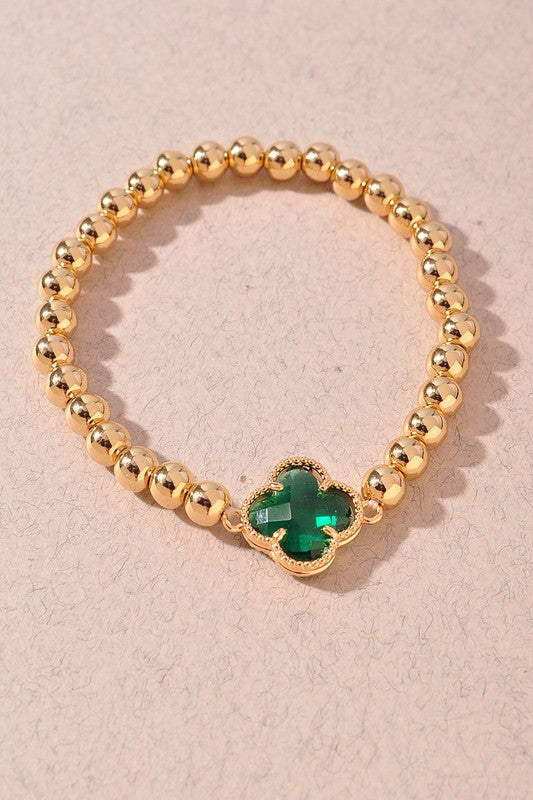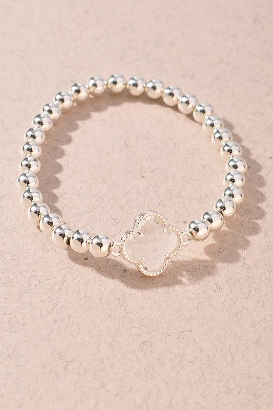 This is a Clover Charm Ball Bead Stretch Bracelet featuring a beautiful