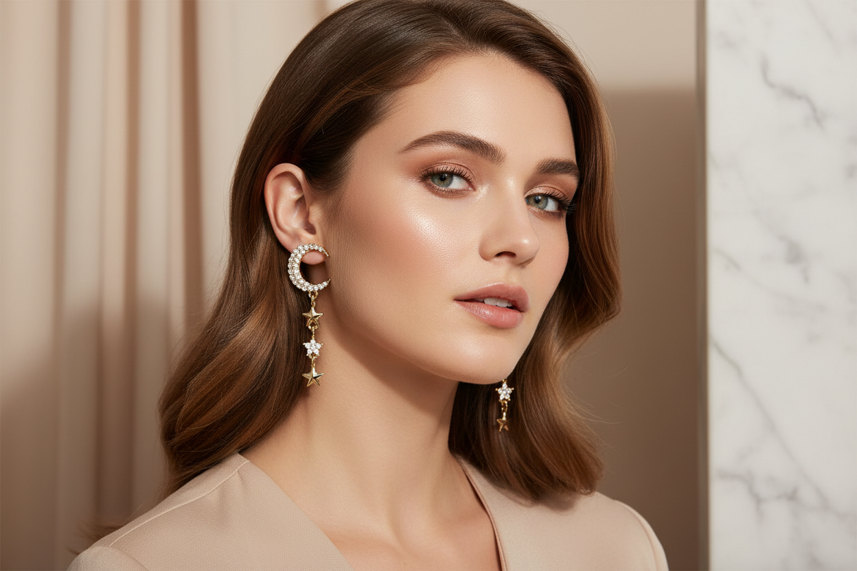 Elevate your evening look with these enchanting Crescent Moon 3 Star Drop earrings. Delicate celestial-inspired design features a graceful crescent moon paired with cascading stars that catch light beautifully as you move. Crafted for those who appreciate subtle sophistication, these drops add an ethereal touch to any outfit—from casual daytime wear to special occasions. The lightweight construction ensures all-day comfort, while the timeless celestial motif makes them a versatile staple in your jewelry collection. Perfect for gifting or treating yourself to a piece that sparks conversation.