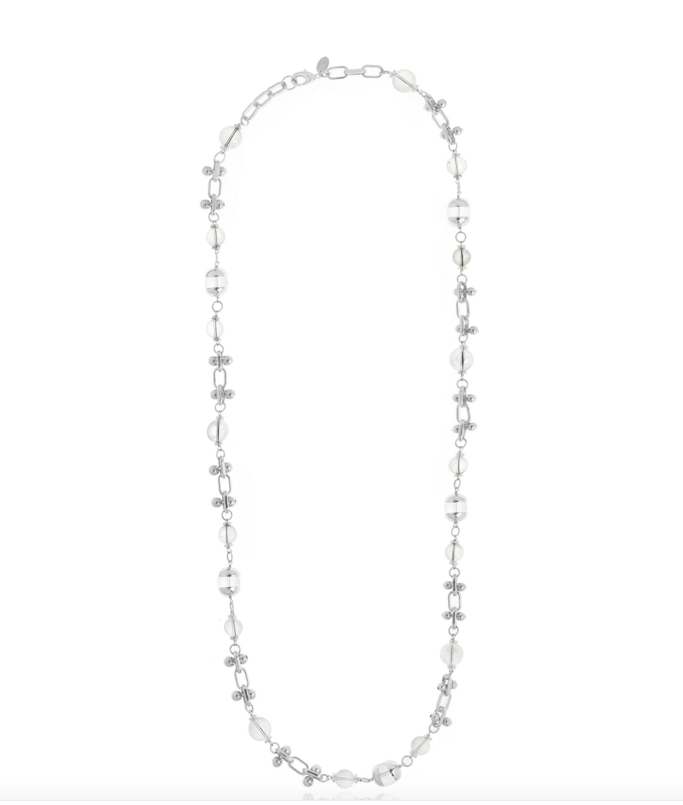 Elegant and luminous, the Liuce Long Necklace is a celebration of grace and divine protection. Featuring a refined combination of clear crystals, silver-toned beads, and baroque pearls, its delicate yet intricate structure evokes celestial harmony.