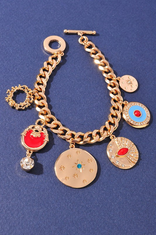 colorful enamel accents, sparkling crystals, and engraved motifs. The bracelet secures