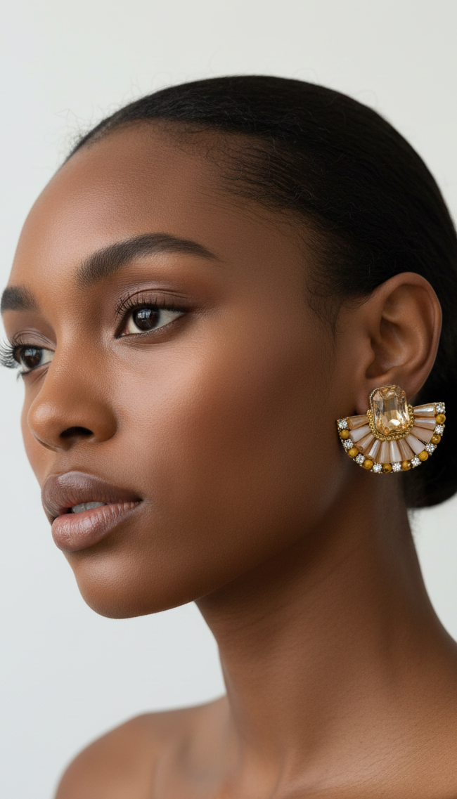 Crystal fan beaded earring with intricate metal detailing and shimmering beaded accents. The textured design catches light beautifully, adding dimension and elegance to any look. Perfect for layering or wearing solo, these studs deliver sophisticated sparkle without overwhelming your style. Lightweight and comfortable for all-day wear, they're an effortless way to elevate casual outfits or complement evening ensembles.