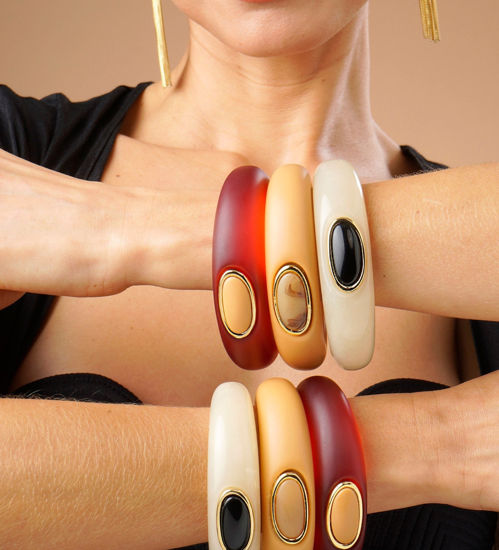 Make a bold statement with this stunning resin drop bangle in rich ruby red, complete with an eye-catching center detail that adds dimension and intrigue. The smooth resin construction feels luxurious against your skin while remaining feather-light for comfortable everyday wear. Whether you're dressing up for an evening out or adding polish to your daily look, this versatile piece commands attention. Stack it with complementary bangles or let it shine as your signature accessory—either way, it's the perfect way to express your style with confidence.