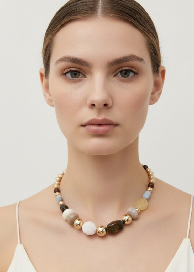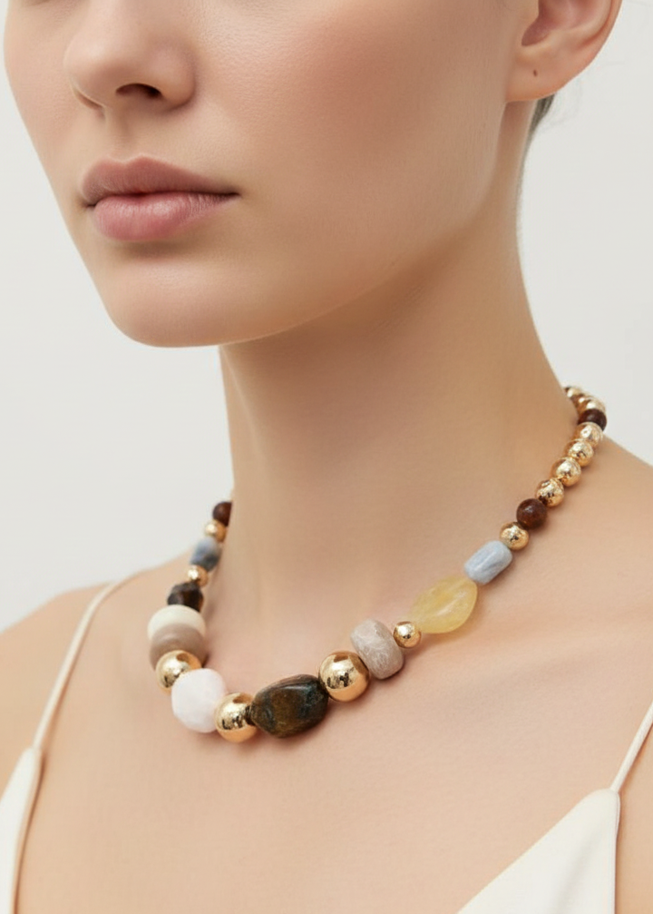 Mix Chunky Beads Necklace Make a bold statement with this eye-catching chunky bead necklace, featuring a rich blend of brown resin beads in varying sizes and textures. The layered design creates instant dimension and pairs effortlessly with casual tees, sweaters, or elevated basics. Perfect for adding warmth and personality to any outfit, this versatile piece transitions seamlessly from day to night. Lightweight resin construction ensures all-day comfort without the weight, while the earthy brown tones complement every skin tone and wardrobe. Elevate your accessory game with a necklace that delivers both style and wearability.