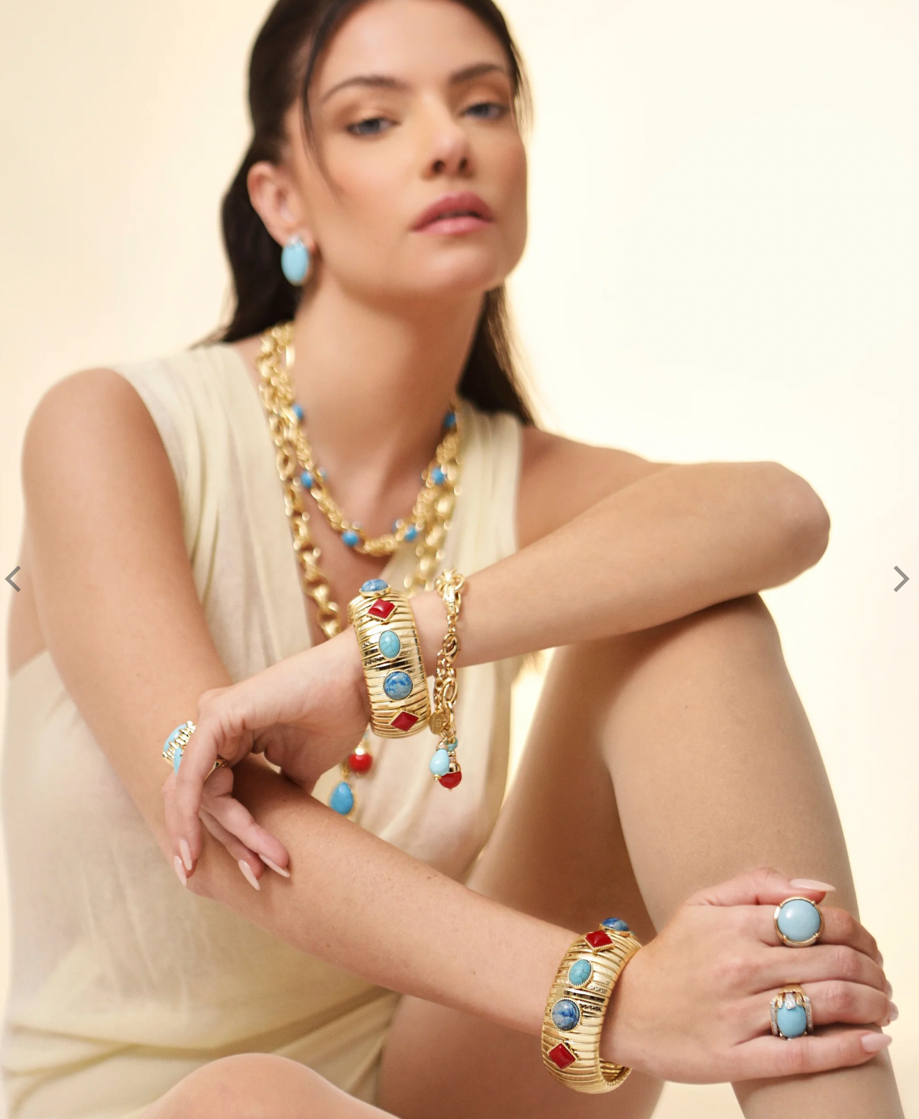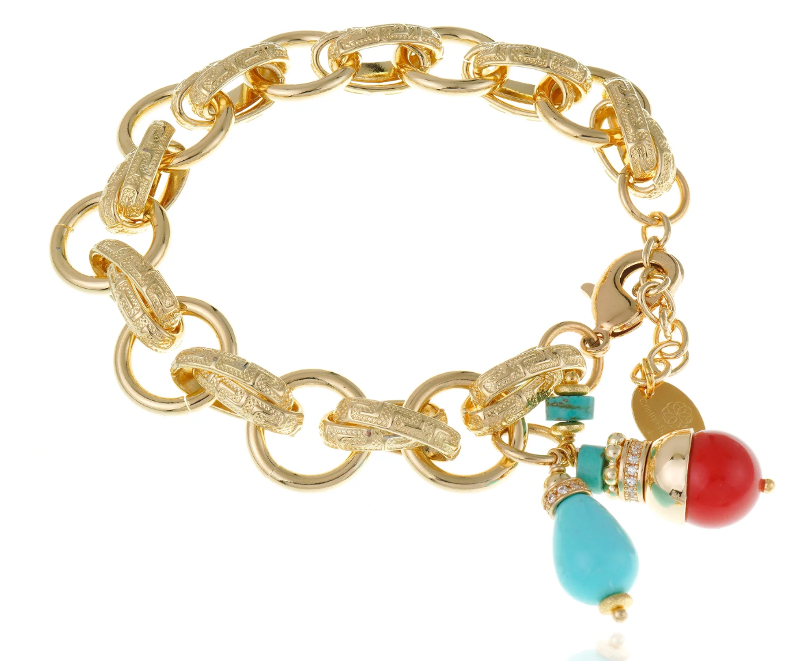 The Sirena Bracelet is a captivating statement piece that effortlessly elevates your everyday style. Handcrafted with 18K gold-plated bronze links, this Italian-made bracelet features stunning dangling charms of reconstituted turquoise and coral, brilliantly accented with pavé-set zirconias that catch the light beautifully. The fluid, multi-link design moves gracefully with you, creating dynamic visual interest from every angle. Secured with a reliable lobster clasp and adjustable extender, it adapts to your wrist perfectly. Whether you're dressing up or down, this artisanal treasure brings bold elegance and undeniable charm to any occasion.