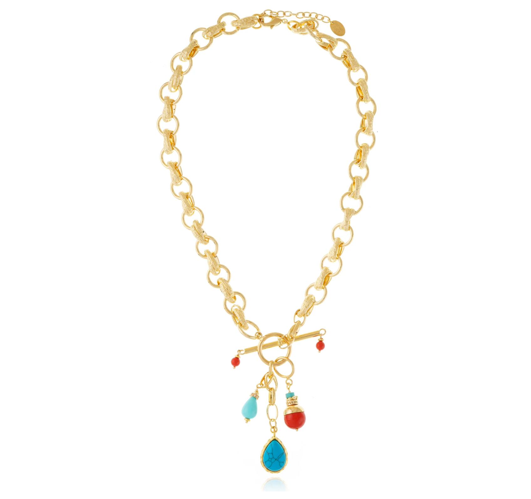 Make a splash with the Sirena Necklace, where Mediterranean elegance meets modern flair. This gold-plated bronze stunner features an interlocking chain adorned with vibrant reconstituted turquoise and coral drops, finished with sparkling pavé-set zirconia accents. The bold color contrast and luxurious textures create an undeniably striking statement piece that effortlessly transitions from daytime sophistication to evening glamour. Secured with a convenient toggle clasp and extender, this Italian-crafted necklace is the perfect way to elevate any outfit with timeless, artisanal charm.
