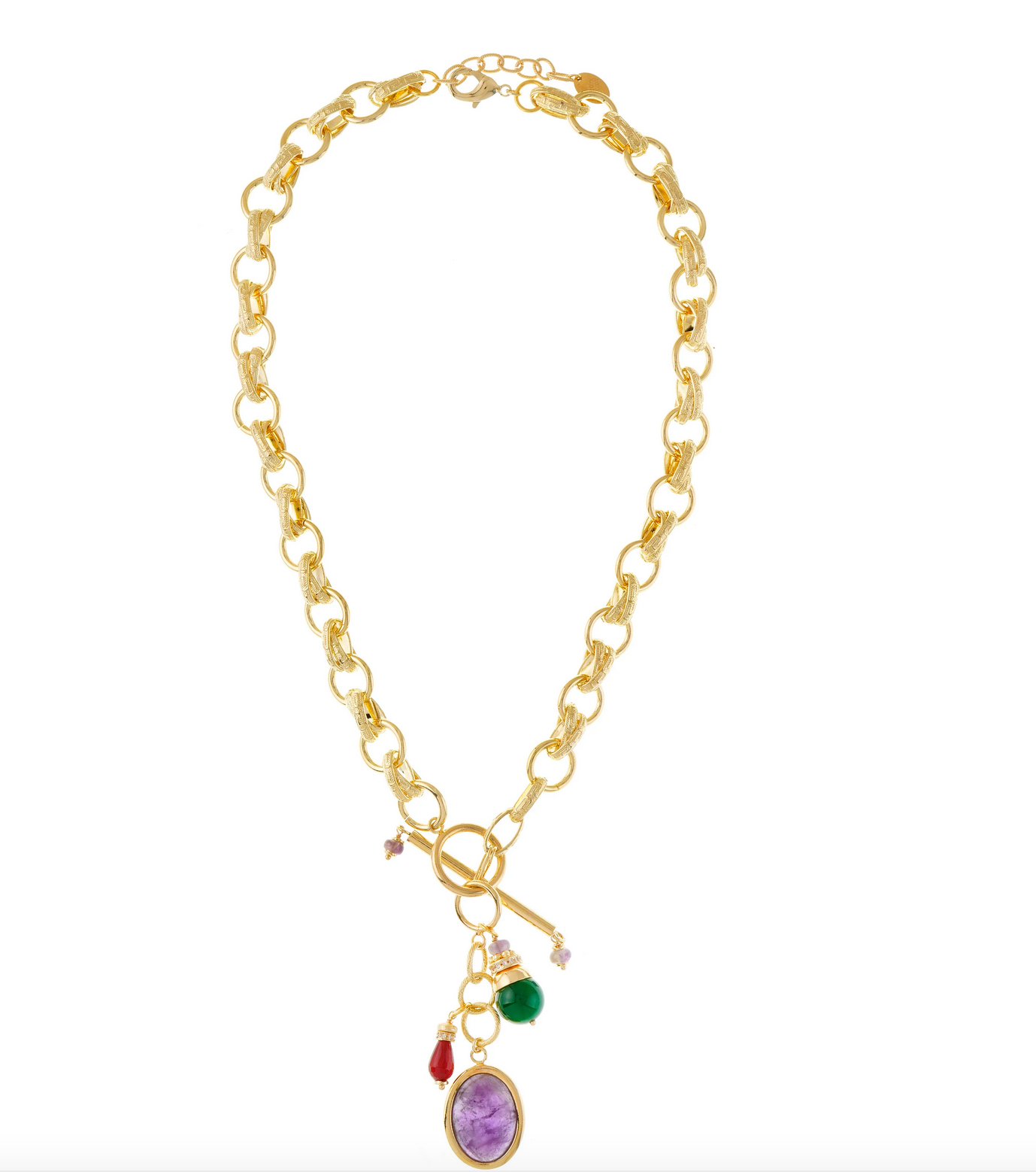With a textured link chain and an elegant front toggle closure, this necklace is adorned with vibrant charms — including a faceted green agate, rich red agate, and a striking amethyst centerpiece. Each detail adds a whimsical, yet refined energy to your look.