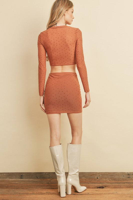 Embellished mesh mini skirt. Lined. Modelis 5'10" and wearing size Small. Complete the set with the crop top, FT9744A.