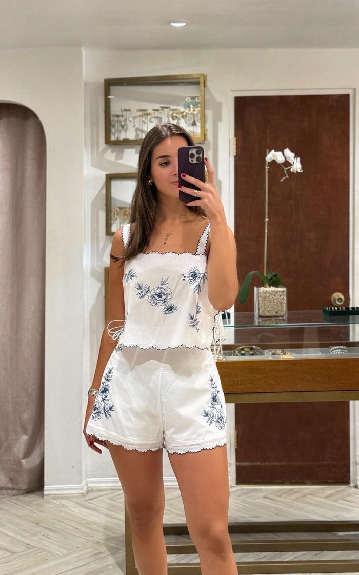 Floral embroidery sleeveless shoulder strap with embroidery scallop edge and side self tie detail crop top and matching side zipper shorts set. Lining in shorts.