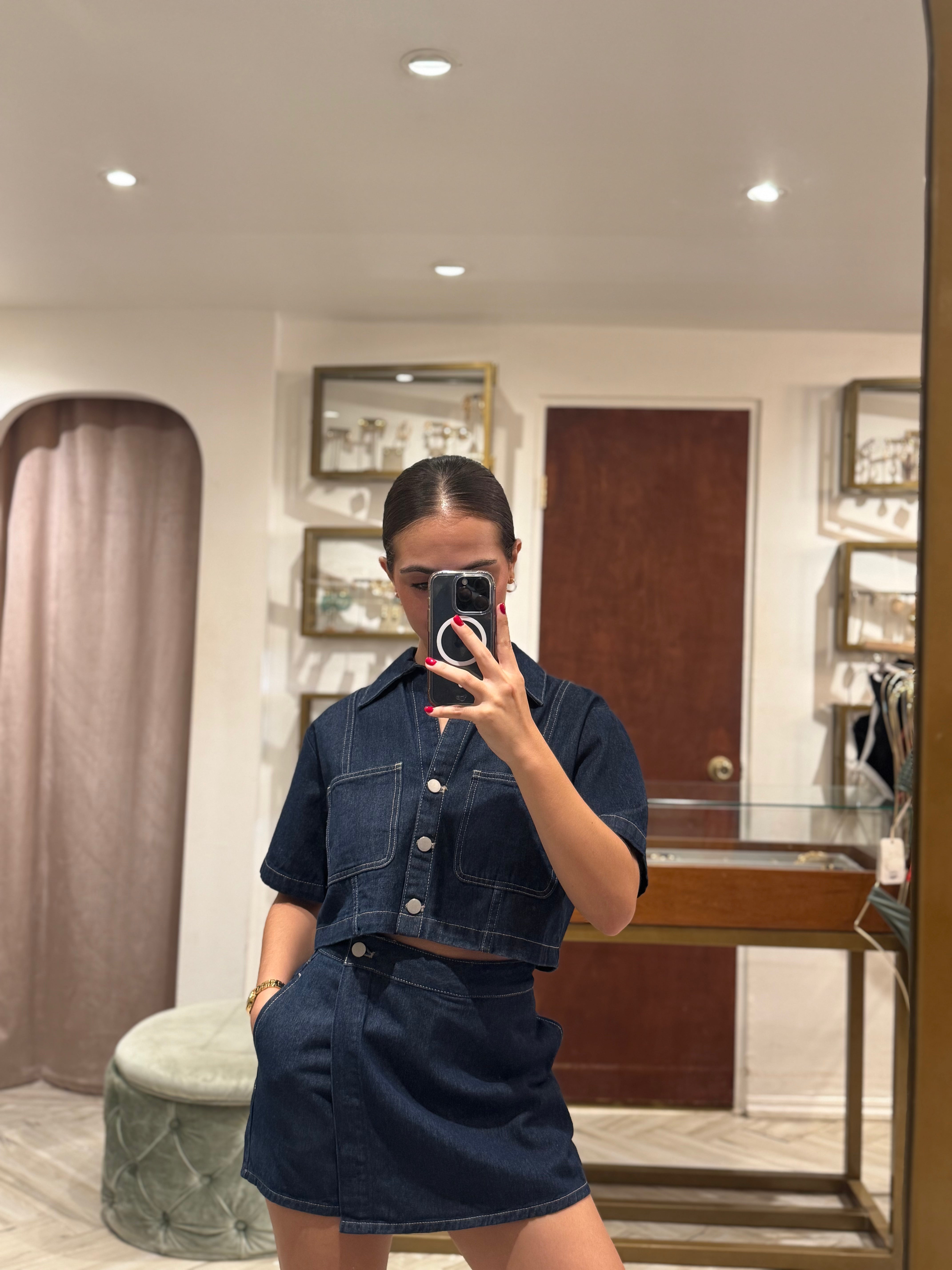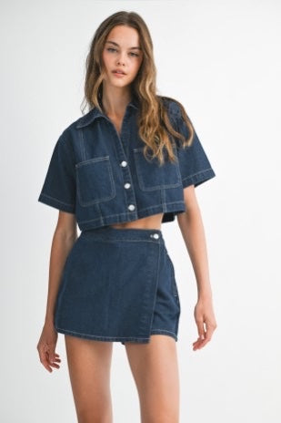 Elevate your casual wardrobe with the Noa Set, featuring a dark wash denim button-down crop top paired with a matching mini skirt. This coordinated duo offers a flattering fit and timeless style, perfect for day-to-night wear. The breathable short sleeves keep you comfortable, while the cropped design adds a modern edge. Whether you're heading out with friends or enjoying a weekend adventure, the Noa Set combines effortless cool with versatile charm.