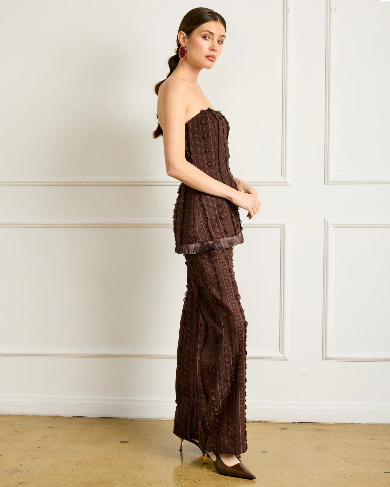 Elevate your wardrobe with the Panna Pants, featuring rich brown embroidered detailing that adds a subtle yet striking touch. Crafted for both style and comfort, these pants effortlessly blend sophistication with everyday wearability. Perfect for making a refined statement at work or social occasions, their intricate embroidery sets you apart with understated elegance. Choose Panna Pants to experience versatile fashion that enhances your confidence and complements your unique style.