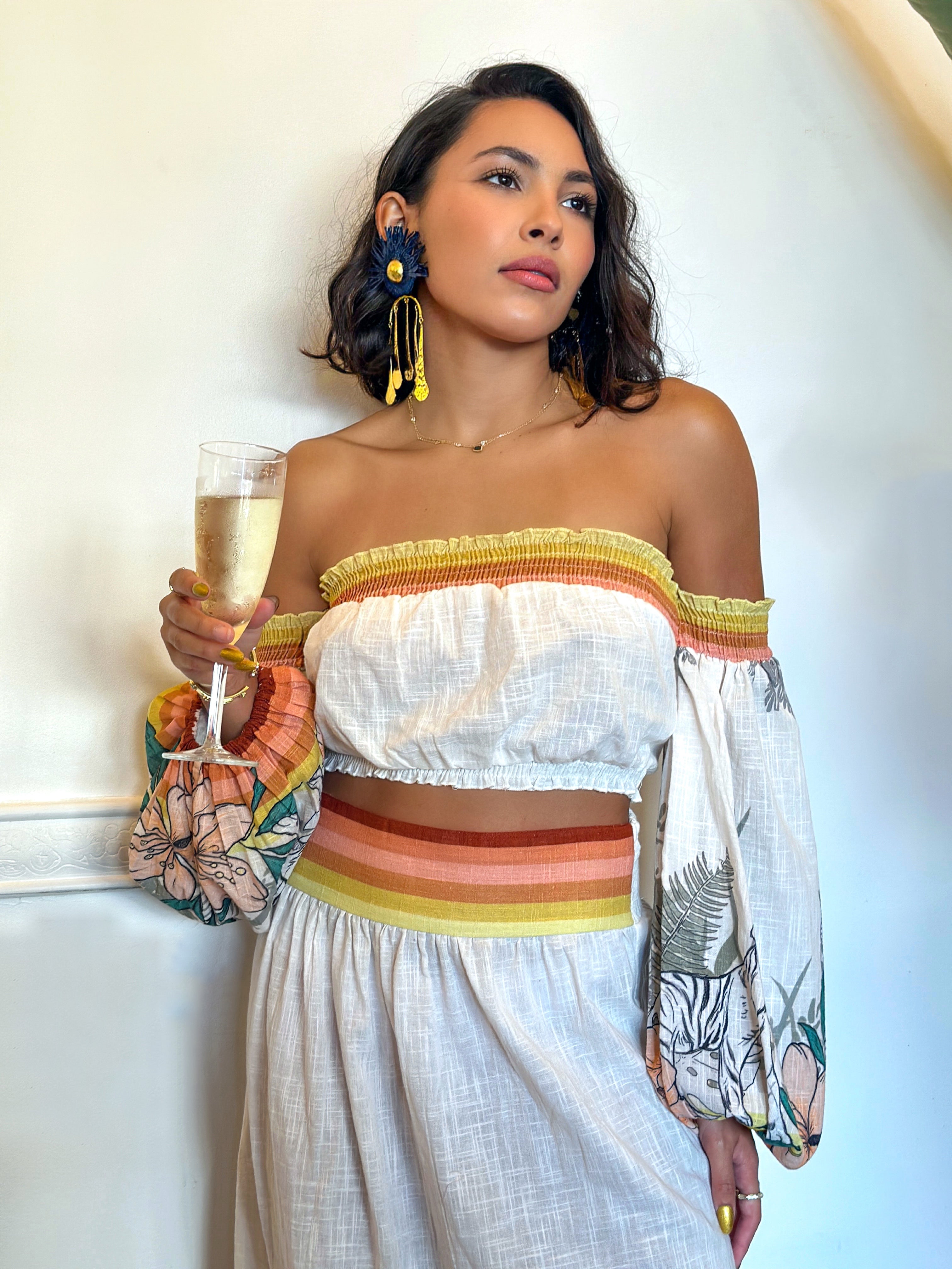 The Rio Grande Top is an off shoulder style featuring full puff sleeves. Look fashionable, comfortable and always in style.