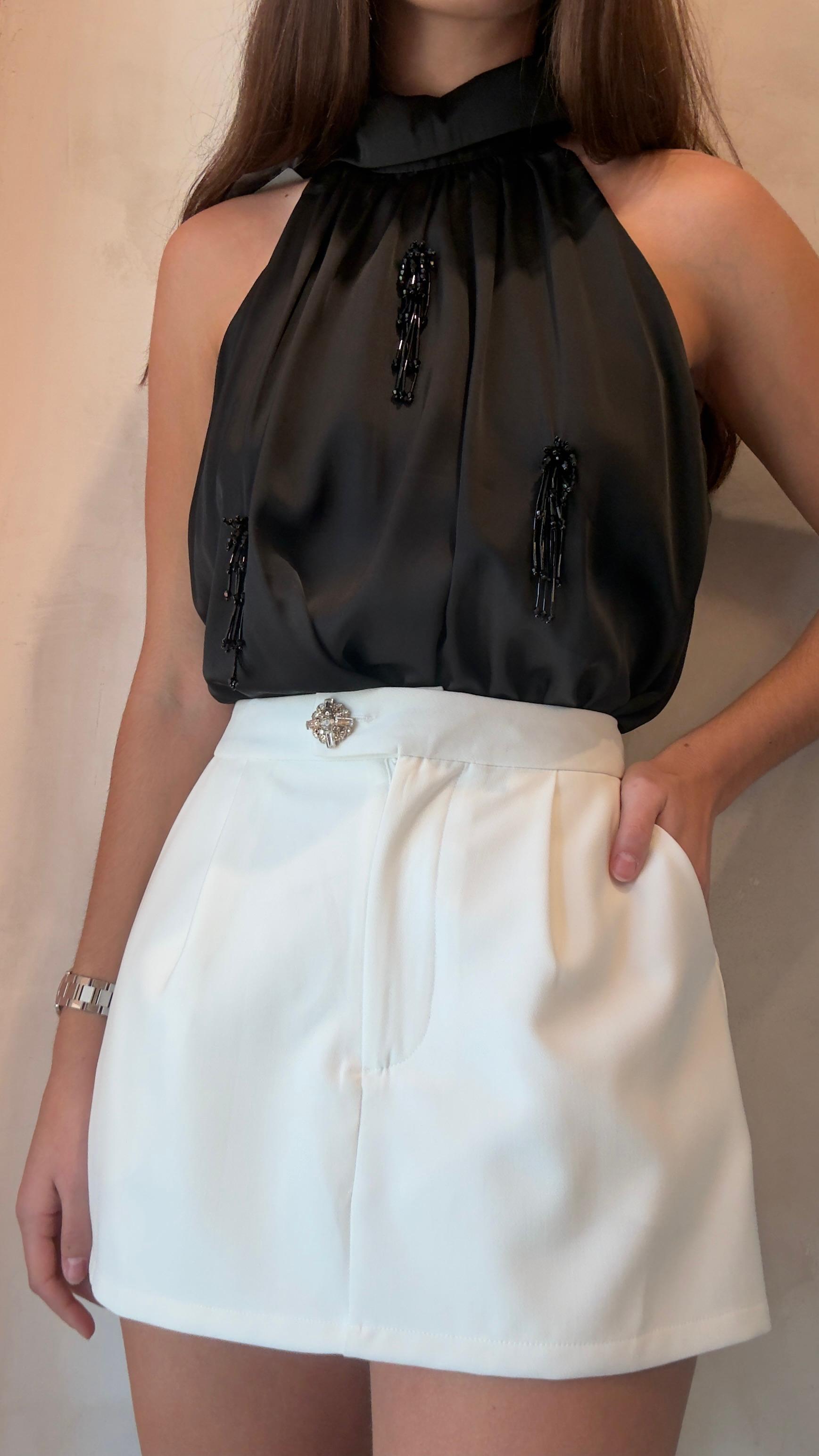 Elevate your evening look with this stunning black halter top, where sophisticated elegance meets eye-catching detail. Delicate beadwork adorns the neckline and bodice, creating a luxurious focal point that commands attention at any occasion. The classic halter silhouette flatters your frame while the intricate beading adds that touch of glamour you've been searching for. Perfect for date nights, cocktail events, or whenever you want to feel confident and refined. This piece transitions seamlessly from special occasions to upscale casual settings, making it a versatile investment for your wardrobe.