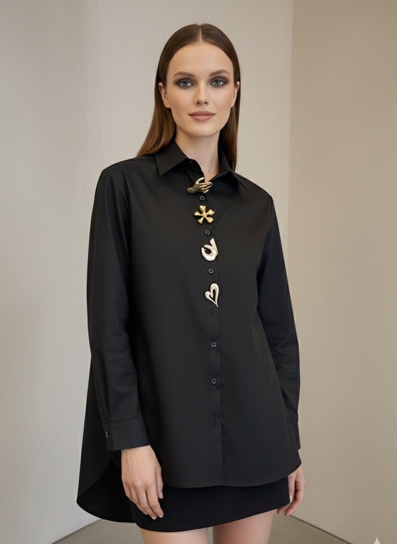 Elevate your everyday wardrobe with this striking black button-down top that combines timeless style with meaningful details. Featuring decorative buttons adorned with heart, peace sign, and hand motifs, this piece transforms a classic silhouette into a statement-making essential. Perfect for expressing your individuality while maintaining sophisticated appeal, it pairs effortlessly with jeans, skirts, or trousers. The thoughtful embellishments add personality and conversation-starting charm to any outfit. A versatile must-have that proves fashion can be both polished and expressive.