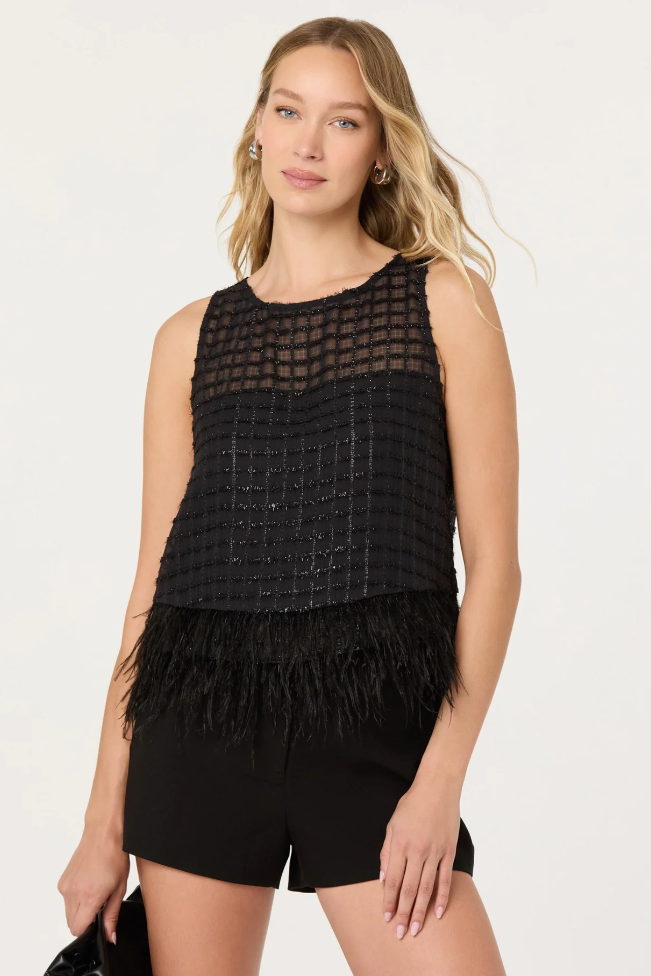 Elevate your style with the Etheos Top, a black sleeveless blouse that blends sheer elegance with modern edge. Crafted from transparent fabric, it features delicate tulle fringe accents that add movement and allure to your look. Perfect for evening outings or special occasions, this top offers a bold yet sophisticated statement that enhances your wardrobe with a touch of avant-garde charm.