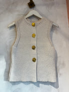 Elevate your wardrobe with the Hana Top, a sleeveless beige vest sweater designed for effortless style. Its soft knit fabric offers comfortable layering, while the eye-catching golden sun buttons add a unique, radiant touch. Perfect for pairing with your favorite jeans or skirts, this versatile piece brings warmth and elegance to any outfit. Make a statement with the subtle charm of the Hana Top.