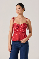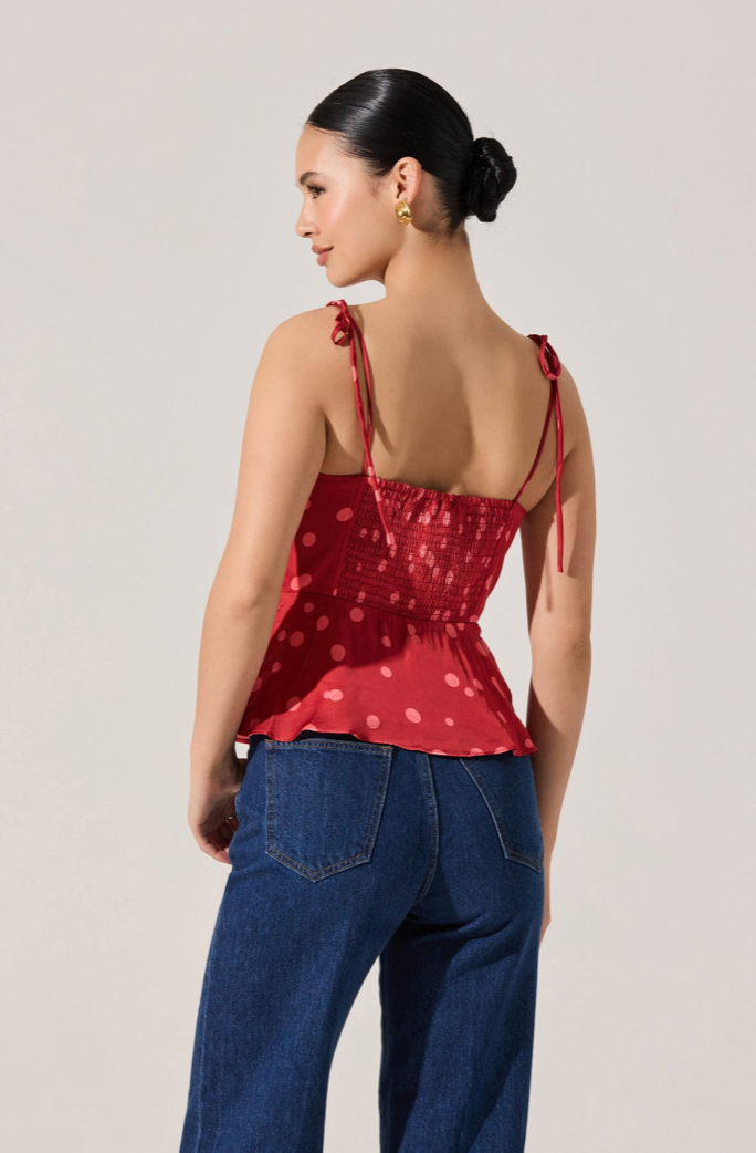 Elevate your style with the Selina Top, featuring a charming red polka dot pattern and a flattering sweetheart neckline. The peplum silhouette enhances your waist, while adjustable tie straps ensure a perfect, comfortable fit. This top effortlessly combines vintage-inspired charm with modern elegance, making it ideal for both casual outings and special occasions. Add a playful yet sophisticated touch to your wardrobe with the Selina Top.