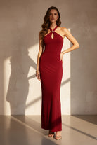 Elevate your evening look with the Apple Smith Maxi Dress, a stunning deep red satin gown designed to turn heads. The luxurious halter neckline frames your shoulders beautifully, while the daring low back creates an alluring silhouette that commands attention. Delicate keyhole gold hardware detailing adds a touch of sophisticated glamour, making this dress perfect for formal events, galas, or unforgettable nights out. The flowing maxi length ensures timeless elegance with every step. Make a bold statement in a dress that combines classic sophistication with modern edge.