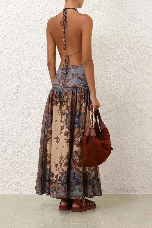 Experience effortless elegance with the Ascension Plunge Halter Maxi from our Summer Swim 2025 Collection. Crafted from 100% cotton, this maxi dress features a striking plunging V-neckline and a fitted waist with tasteful cut-outs, enhancing your silhouette. The open back is beautifully finished with self-tie beaded drawstrings, adding a touch of sophistication. With internal covered buttons, a lined bodice for comfort, and front skirt splits, this dress flows gracefully while keeping you cool and stylish all day long. Perfect for making a statement at any summer event.