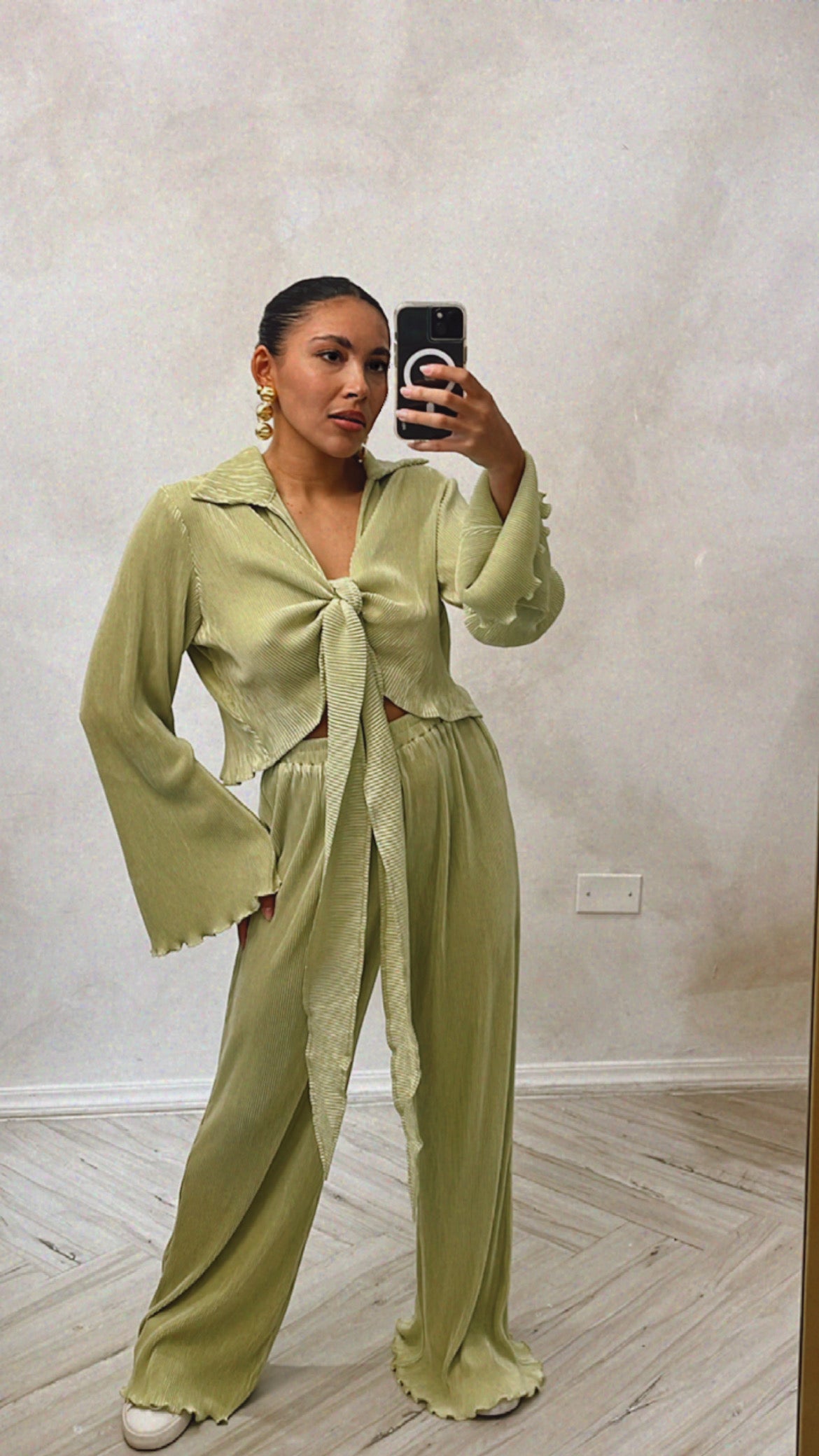 New Satin Olive Green pleated wide leg long pant.