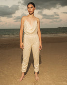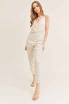 Cowl neckline sequin open back jumpsuit with full pants lining inside.
