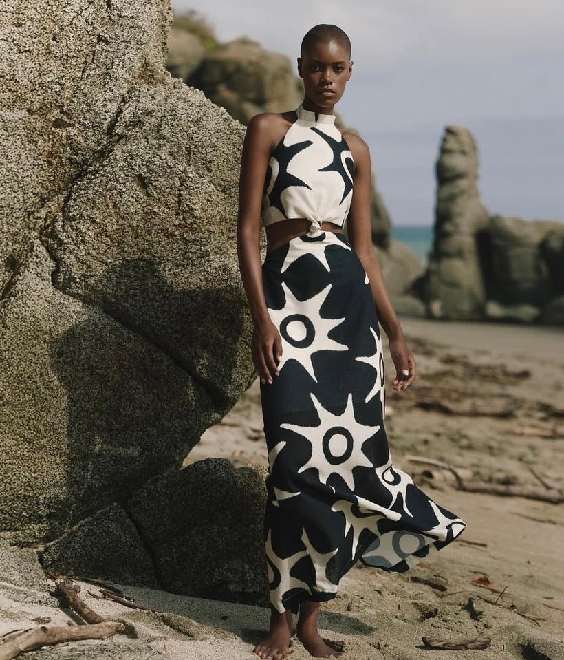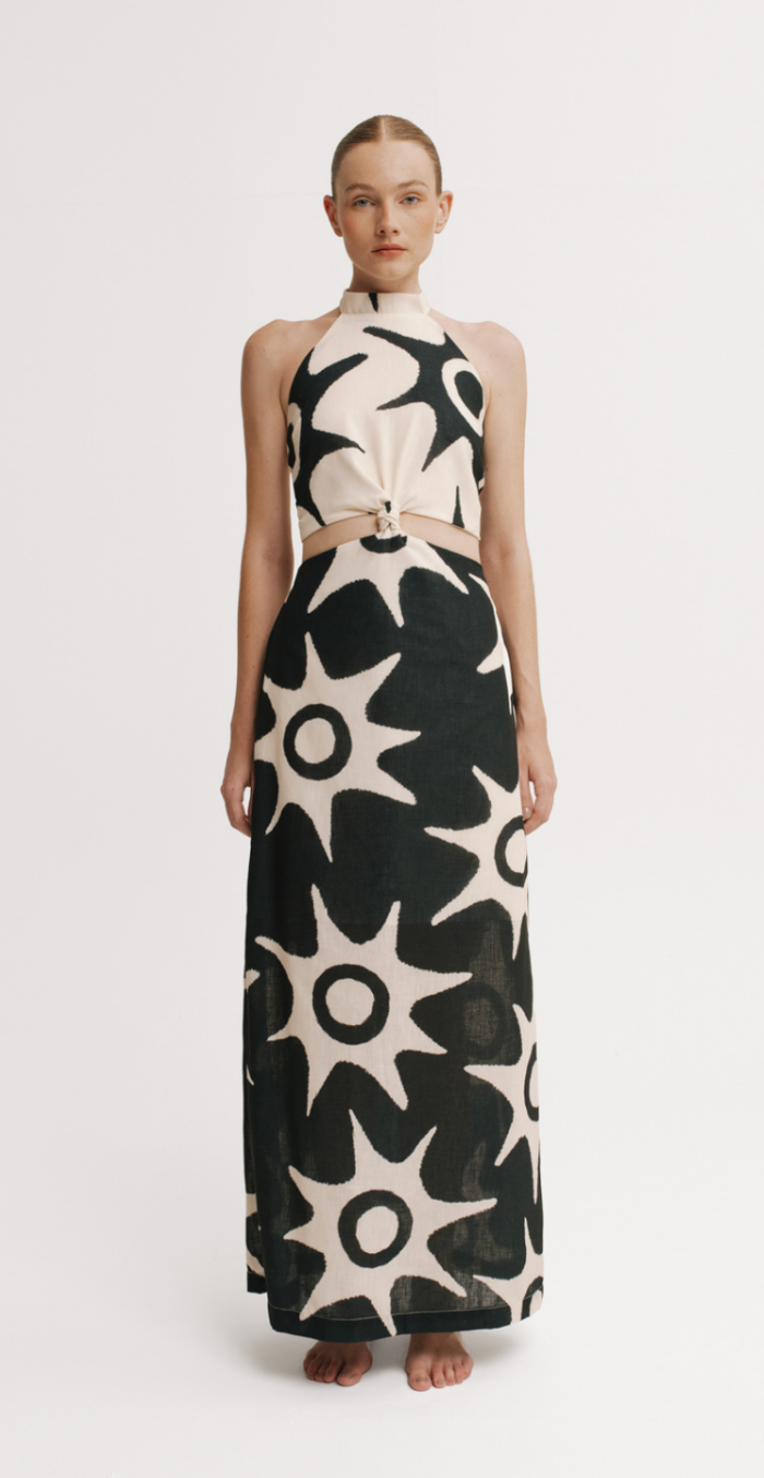 Elevate your style with the Camille Solar Dress, a stunning black and white linen maxi featuring a halter neckline and an open back that beautifully highlights your silhouette. Thoughtful waist cutouts add a modern touch while enhancing your natural curves. Perfect for warm days or elegant evenings, this dress combines comfort with chic design to keep you effortlessly cool and captivating.