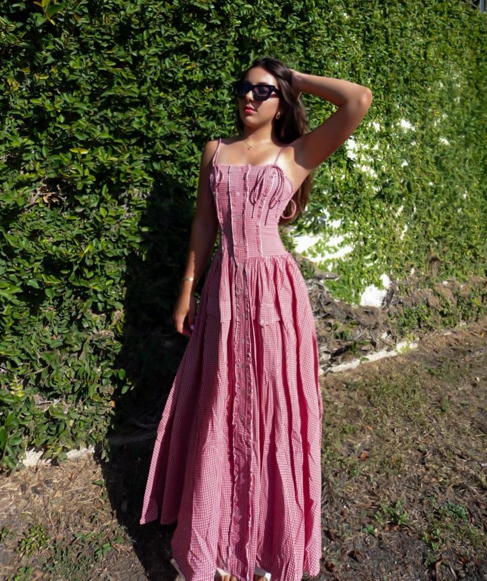 Ruffle placket gingham midi dress