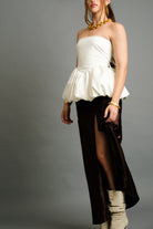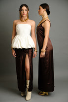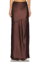 The Dalton Skirt offers elegant comfort with its smooth chocolate satin fabric and sophisticated side slit. Featuring a pull-on style with an elastic waistband for easy wear, it’s partially lined to ensure a flattering fit. Measuring approximately 44 inches in length, this imported skirt pairs effortlessly with your favorite tops for a polished, refined look. Dry clean recommended to maintain its luxurious sheen and quality.