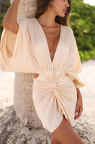 Short front twist Butter color dress.