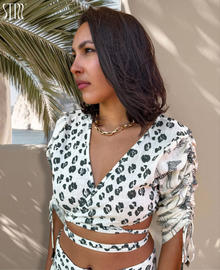 This Lovely Crop Top comes in ivory color with gold lurex details, ruffle straps, and an elastic body to ensure a perfect fit.