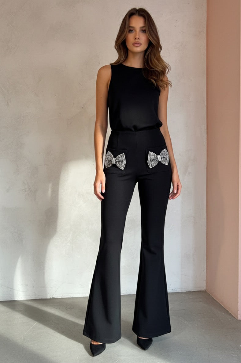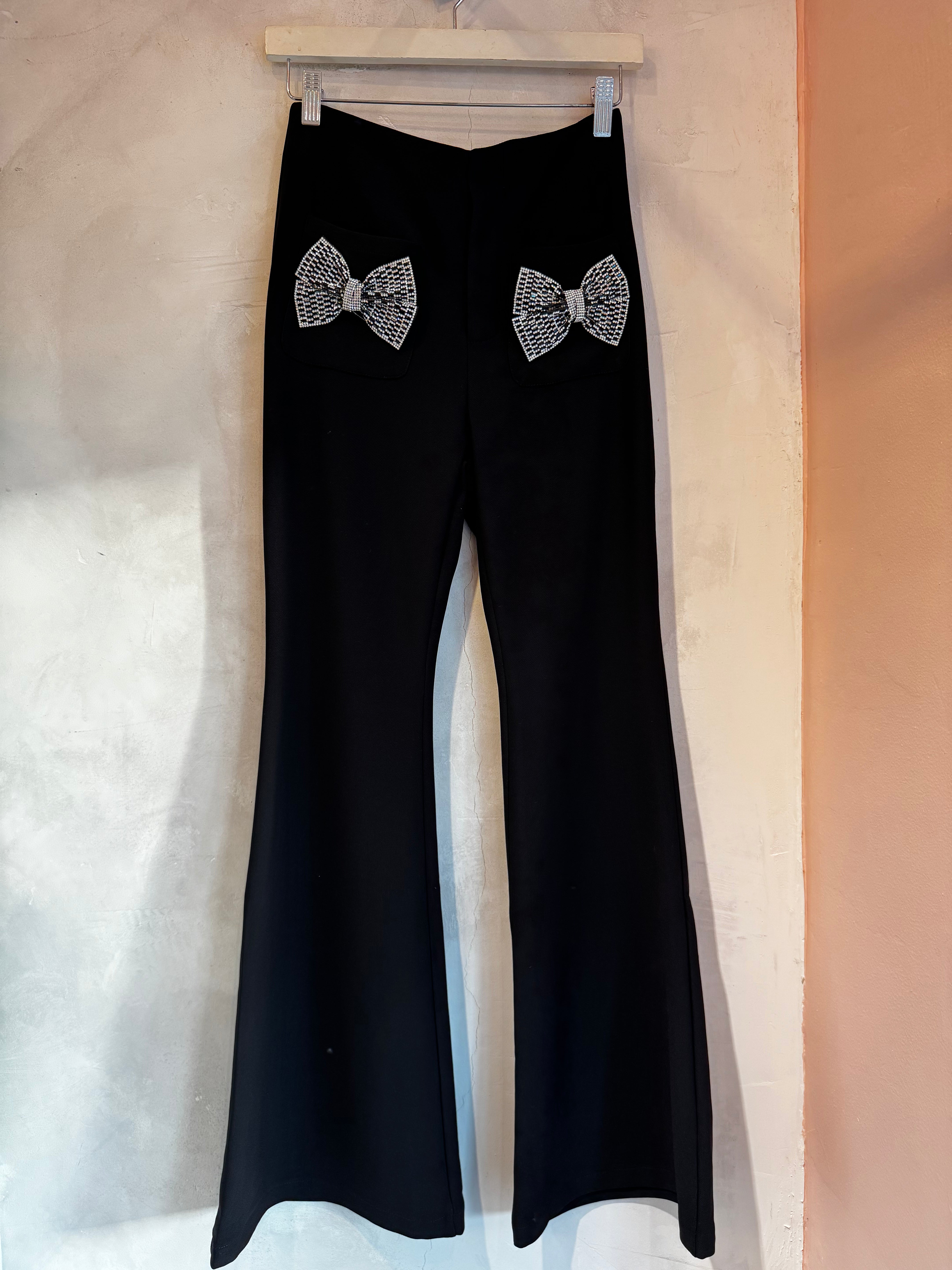 Elevate your style with the Frame Bow Pant, featuring a sleek black flare silhouette accented by elegant bows on each side of the hips. This distinctive detail adds a feminine touch while flattering your figure, making these pants perfect for both chic daytime looks and sophisticated evening outings. Embrace comfort and flair in one versatile piece that effortlessly enhances your wardrobe.