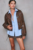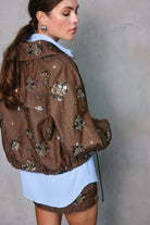 Elevate your wardrobe with the Harriet Jacket, crafted from a heavyweight, non-stretch woven fabric richly embellished with beads. This sophisticated piece features a collared neck and long sleeves with comfortable elastic cuffs, securing with a classic button and buttonhole closure. Its warm brown hue adds versatile elegance, perfect for layering in cooler weather while making a stylish statement.
