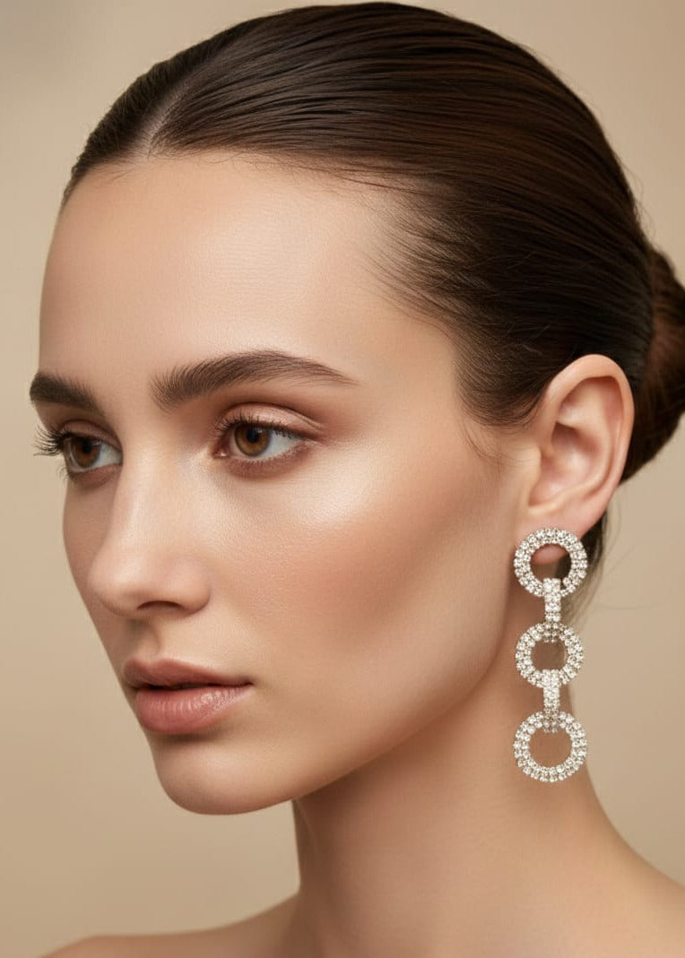 Make a statement with these captivating three-ring drop earrings, where cascading rhinestones create a mesmerizing sparkle with every movement. The geometric stacked design offers modern sophistication while the brilliant crystal accents ensure maximum light reflection and visual impact. Ideal for those who want to stand out without overwhelming their look, these earrings transition seamlessly from office to evening wear. Lightweight construction keeps them comfortable for all-day wear while delivering the luxury aesthetic you deserve.