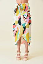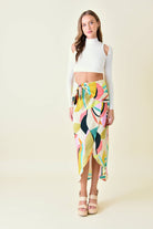 This stunning midi skirt features an eye-catching, abstract print reminiscent. The flattering wrap skirt design is sure to turn heads. Designed to be worn during the warmer spring and summer months, making it the ideal addition to a summer wardrobe. With its flattering length and versatile style, you can dress it up for a night out or keep it casual for a day at the beach.