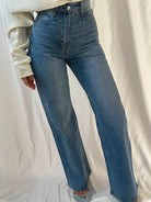 A pair of wide leg jeans featuring rhinestone detail, a classic 5-pocket construction and a zip-fly closure. Rise: 12", Inseam: 33" Model is 5'7" and wearing a size 3.