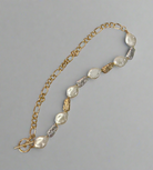 Simple necklace with pearl-like beads, silver and gold accents and a gold chain with a toggle clasp.
